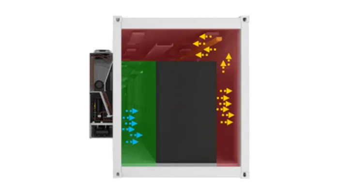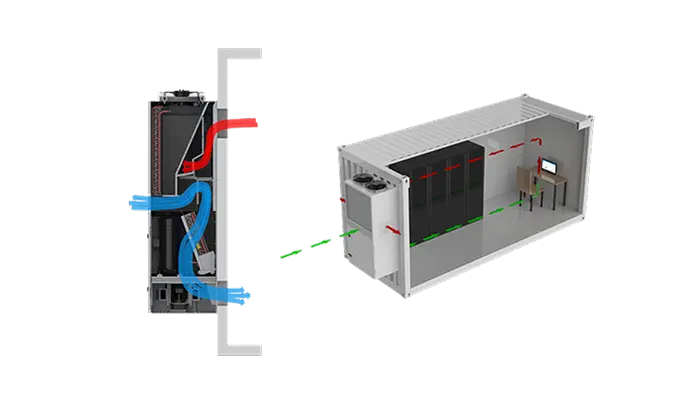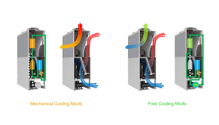 During low outdoor temperatures, switches to free cooling mode, using outdoor air for cooling without compressors. It significantly reduces energy consumption and operational costs.